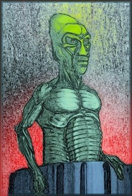 George's knees buckled when he turned and saw a huge reptilian-looking being! He was later able to describe the alien as having a bloated body with long spindly anthropoid arms forking into only two thick, if equally spindly, fingers. Suddenly, without any warning, the being moved towards him. George said the figure seemed to glide acoss the surface of the road. He further described the lower torso as being a solid mass, a conveyance. Furthermore, it was the source of the sickening sulfur permeating the air.
